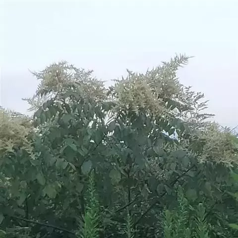 盐肤木(学名:Rhus chinensis Mill.) 是漆树科,盐肤木属落叶小乔木或灌木,高可达10米;小枝棕褐色,叶片多形,卵形或椭圆状卵形或长圆形,先端急尖,基部圆形,顶生小叶基部楔形,叶面暗绿色,叶背粉绿色,小叶无柄。圆锥花序宽大,多分枝,雌花序较短,密被锈色柔毛;苞片披针形,花白色,裂片长卵形,花瓣倒卵状长圆形,开花时外卷;花丝线形,花药卵形,子房不育;卵形,核果球形,略压扁,成熟时红色,8-9月开花,10月结果。