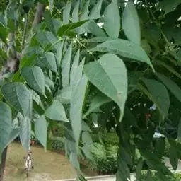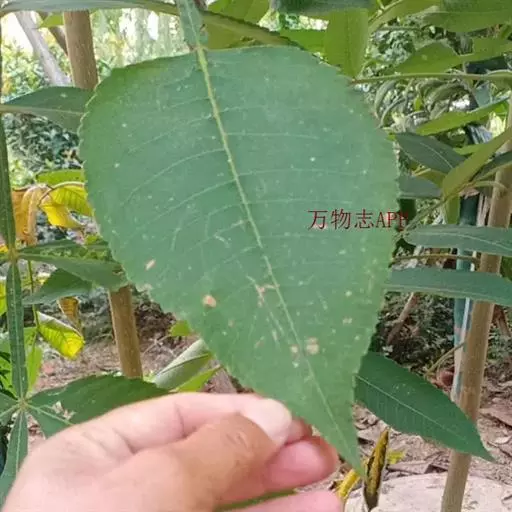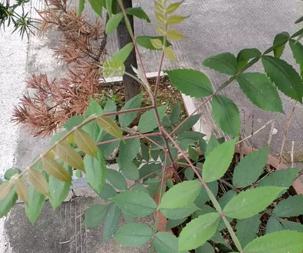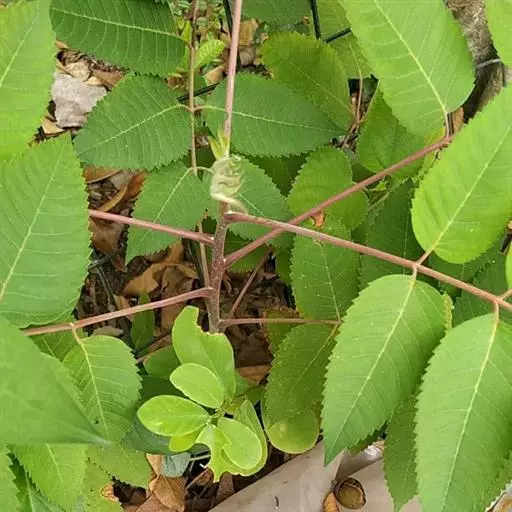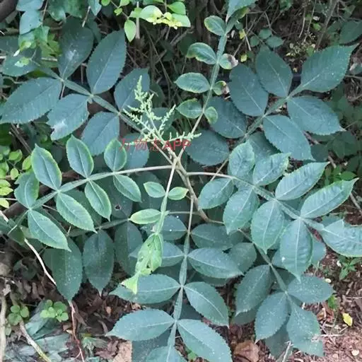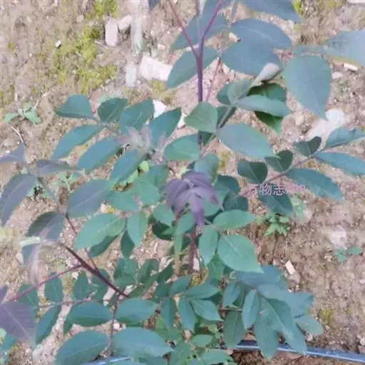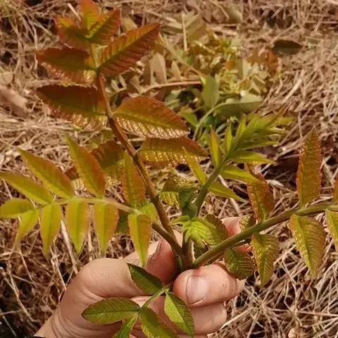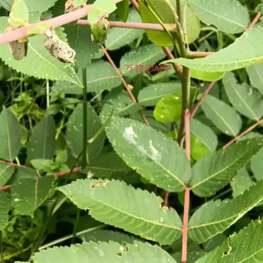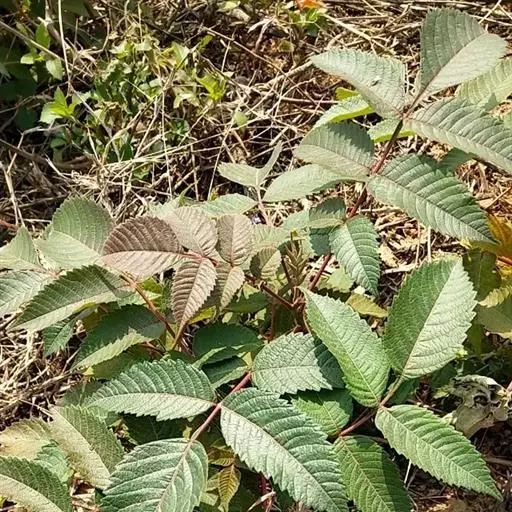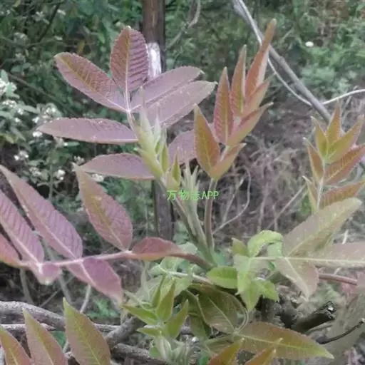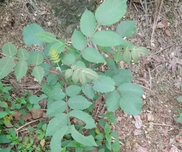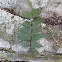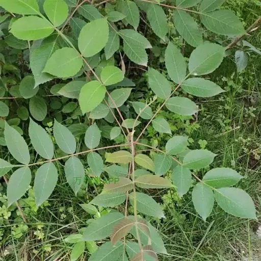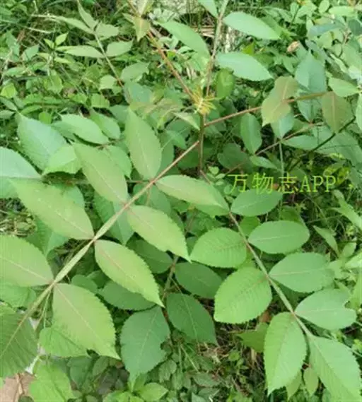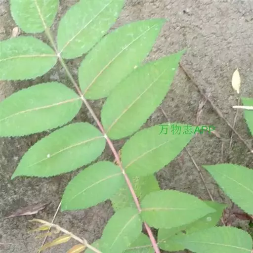 奇数羽状复叶有小叶(2-)3-6对,纸质,边缘具粗钝锯齿,背面密被灰褐色毛,叶轴具宽的叶状翅,小叶自下而上逐渐增大,叶轴和叶柄密被锈色柔毛;小叶多形,卵形或椭圆状卵形或长圆形,长6-12厘米,宽3-7厘米,先端急尖,基部圆形,顶生小叶基部楔形,边缘具粗锯齿或圆齿,叶面暗绿色,叶背粉绿色,被白粉,叶面沿中脉疏被柔毛或近无毛,叶背被锈色柔毛,脉上较密,侧脉和细脉在叶面凹陷,在叶背突起;小叶无柄。