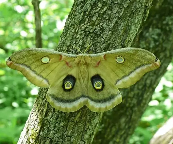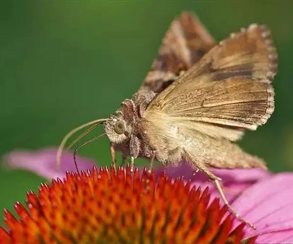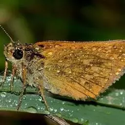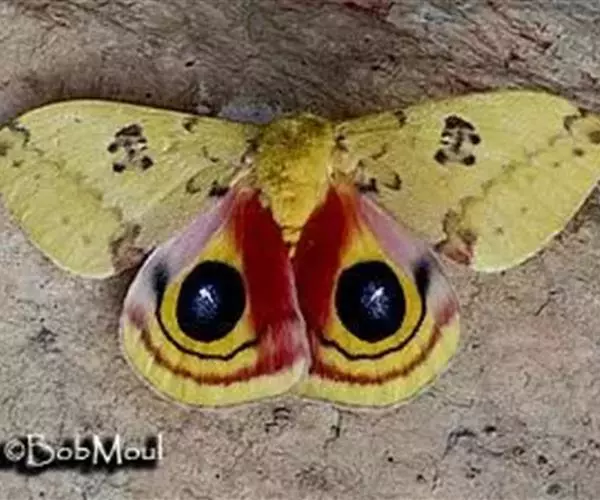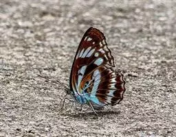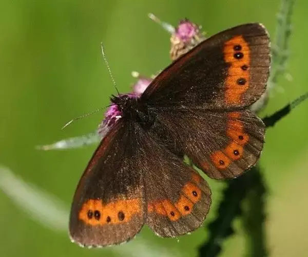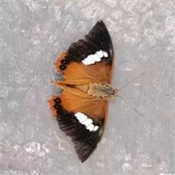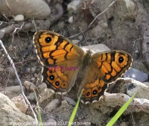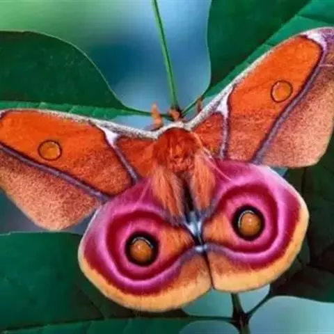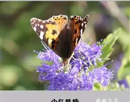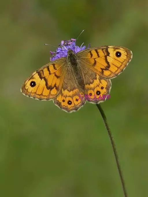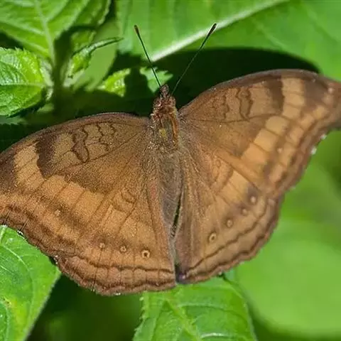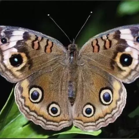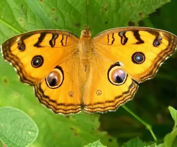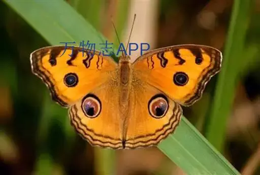 美眼蛱蝶Junonia almana(linnaeus),雄蝶翅展54mm,52mm。翅橙红色,前后翅外缘各有3条黑褐色波状线,翅面各有2个眼斑,前翅眼斑上小下大,后翅眼斑上大下小。前翅前缘褐色,有4个肾形斑,其中基部肾形斑中空,端部1肾形斑与小眼斑相连。该种分夏型和秋型:夏型翅缘较整齐,反面眼斑明显;秋型翅缘有突起,反面呈枯叶状 。幼虫黑褐色,密生枝刺。