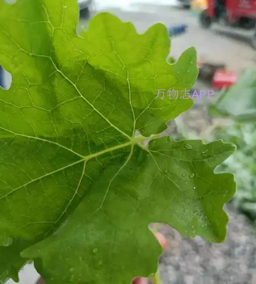 叶片宽卵形或近圆形,长5-27厘米,宽5-25厘米,先端急尖、渐尖、钝或圆形,通常7或9深裂或浅裂,裂片半圆形、方形、兰角形或其他,边缘波状、缺刻状、粗齿或多细齿,表面绿色,无毛,背面多白粉,被易脱落的细绒毛,基出脉通常5,侧脉2对,稀3对,细脉网状,常呈淡红色;叶柄长1-12厘米,上面具浅沟槽。