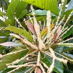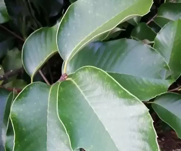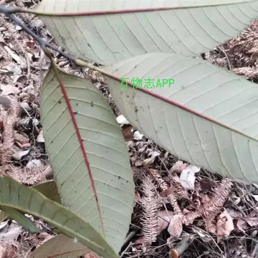 新生嫩叶暗紫褐色,成长叶革质,卵状椭圆形,卵形,长椭圆形或倒卵状椭圆形,长15-30厘米,宽5-10厘米,顶部渐尖,短突尖或尾状,基部近于圆或短楔尖,对称或有时一侧略短且偏斜,叶缘至少在近顶部有锯齿状锐齿,侧脉直达齿端,中脉在叶面凹陷,侧脉每边15-18条,网状脉明显,叶背红褐色(新生叶)、淡棕灰或银灰色(老叶);叶柄长1.5-3厘米。