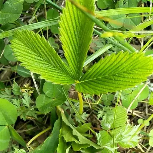 三出复叶,小叶几无柄,倒卵形或菱状卵形,长1-5厘米,宽0.8-3.5厘米,顶端圆钝或急尖,顶生小叶基部楔形,侧生小叶基部偏斜,边缘有缺刻状锯齿,上面绿色,散生疏柔毛,下面淡绿色,有疏柔毛,沿叶脉较密;叶柄被开展柔毛有时上部较密。