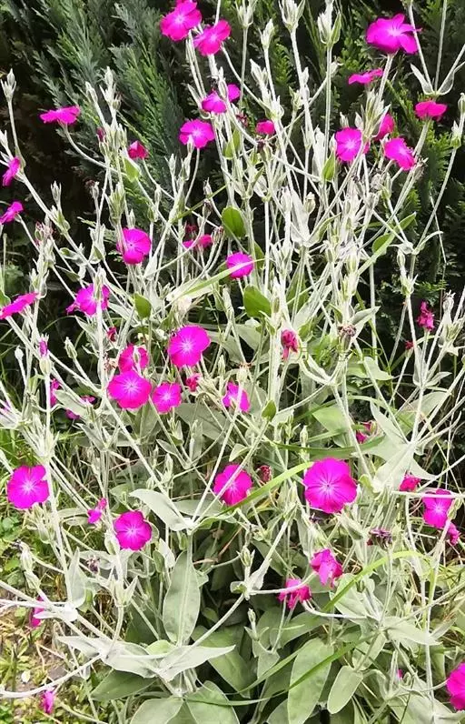 毛剪秋罗,别名:毛缕、醉仙翁,拉丁文名:Lychnis coronaria Desr. 石竹科、剪秋罗属多年生草本,高40-80厘米,全株密被灰白色绒毛。茎直立,粗壮,分枝稀疏。基生叶叶片倒披针形或椭圆形,基部渐狭呈柄状,顶端急尖;茎生叶无柄,较小。二歧聚伞花序稀疏;雌雄蕊柄短,不明显;花瓣深红色,爪倒披针形,无毛,耳缺,瓣片轮廓倒卵形,顶端微凹缺;副花冠片狭披针形,雄蕊不外露。蒴果长圆状卵形,种子肾形,黑褐色,具小瘤。花期5-6月,果期6-7月。图片取自中国植物图库