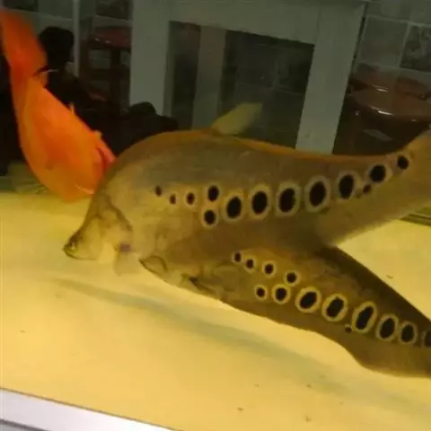 七星刀鱼,学 名Notopterus chitala,又 名鲍孔驼背鱼、七星飞刀、东洋刀、花刀鱼,英文名Clown Knife Fish,原产地泰国、缅甸、印度,体 长70~90cm,适宜水22~28℃,弓背鱼体形特别,背似弓形隆起, 前半身体幅很宽,背鳍之后变窄,至尾 鳍呈尖刀形,微凹上翘。体色为银灰褐 色,由鳃盖后方至尾部并排了几个镶白 边的黑色圆斑。头部尖小,口角无须。背 鳍小,臀鳍和尾鳍相连成一体。腹鳍常 无或发育不完全。幼鱼没有斑点,只有 10~15条淡淡斜纹,成鱼后才变成圆形斑点,并且头部背方突出隆起