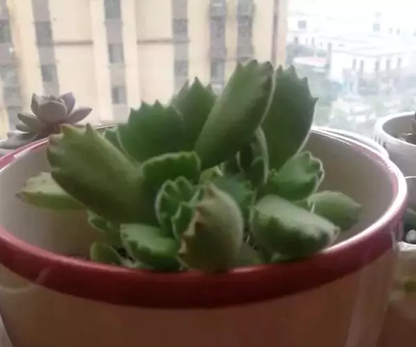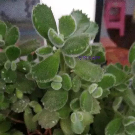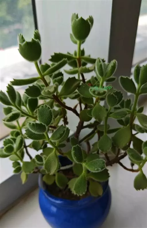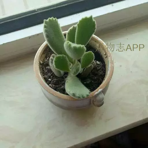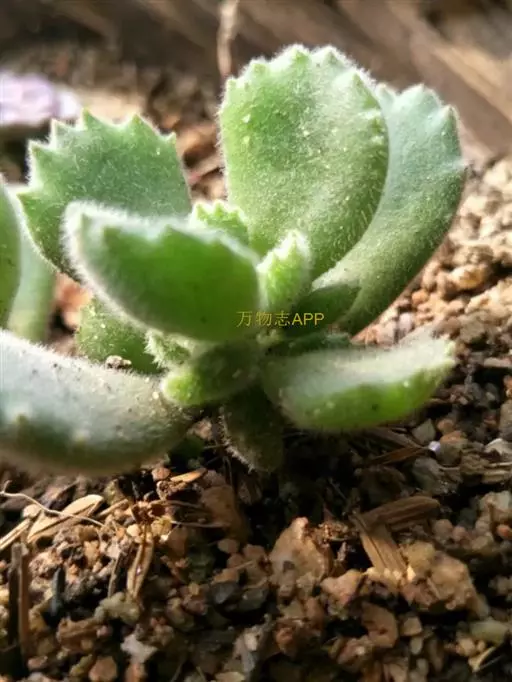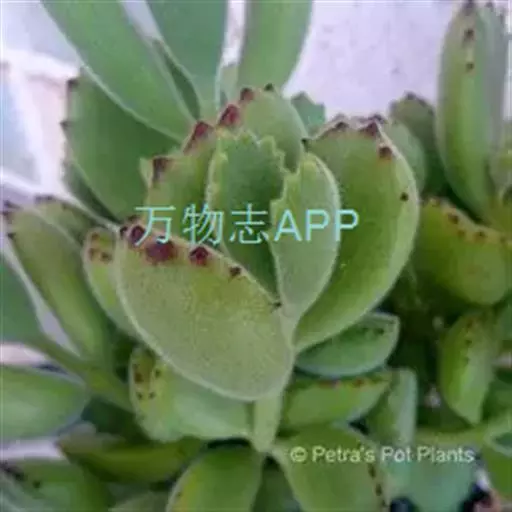 叶片肥厚肉质,倒披针形至长卵圆形,扁匙状,交互对生,长2.3-6.5厘米,宽1.5-3.2厘米;叶表绿色,表面密被白色极细短绒毛,叶端具缺刻,前1/3部分具红色爪样齿,形似熊掌。