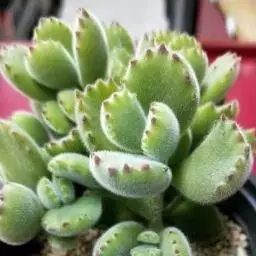 熊童子(学名:Cotyledon tomentosa Harv.)是景天科,银波锦属的多年生肉质草本植物,植株多分枝,茎绿色,肉质叶肥厚,交互对生,卵圆形,绿色,密生白色短毛。叶端具红色爪样齿,二歧聚伞花序,小花黄色,花期7-9月。