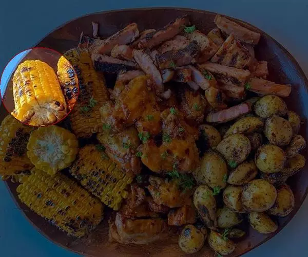 (2)取玉米1根用筷子固定,另一根用铝箔纸包起,并加入调味料A,包密后放入烤架上烧烤,至熟透约须5分钟左右,也可以放入家中烤箱中烤也很方便。
