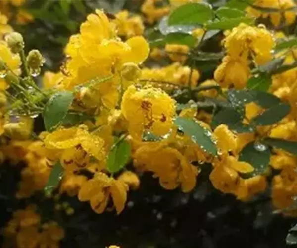 黄花槐)Sophora xanthantha C. Y. Ma)由我国传统国槐与美洲金边黄槐,双荚槐杂交育种而成,每年八月开始开花,蕾如金豆、花如金蝶,长势旺盛,枝繁叶茂、花量大而鲜艳,花色(鸭蛋黄)金黄,故有聚宝黄金树的美称。寒霜降临、盛情不衰,落叶不落花,填补了初冬无观赏花木的空白,不是春光,胜似春光,品味颇高。黄花槐在亚热带常绿,适应在长城以南气温于零下17度以上的地区陆地栽植。