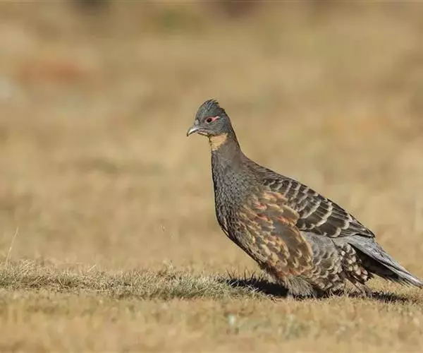 雉鹑(学名:Tetraophasis obscurus):体长44-54厘米。上体大都褐色,头顶与两侧深灰,头顶与枕羽中央有黑褐色纵纹。飞羽暗褐色,羽缘具白色和棕色端斑。中央一对尾羽灰褐色具白色端斑,外侧尾羽灰裼色具黑褐斑,近端部为深黑色,羽端纯白。颏、喉、前颈至尾下覆羽红栗色,胸腹褐灰色,胸羽具黑褐色纵纹,腹羽杂以淡黄和棕色。