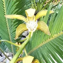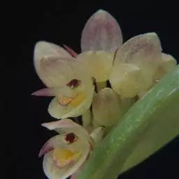 花瓣长圆状披针形,与中萼片近等长,宽约4.5毫米,先端钝;唇瓣轮廓长圆形,长14-15毫米,宽11-12毫米,3裂;侧裂片半圆形或近长圆形,与中裂片几成直角或锐角;中裂片三角形或近四方形,长近5毫米,宽4毫米,先端急尖或近平截;唇盘上面具3条全缘或波浪状的褶片,自基部延伸到近中裂片顶部,并在中裂片分支出2-4条圆齿状或波浪状的褶片;蕊柱长约5毫米;蕊柱足长约5毫米;花粉团黄色。