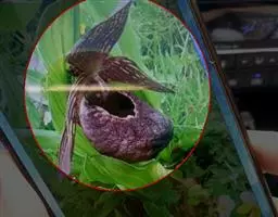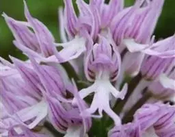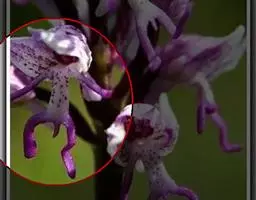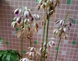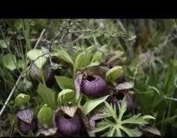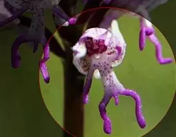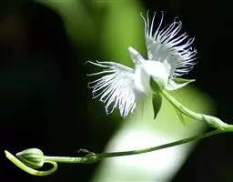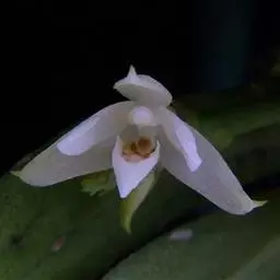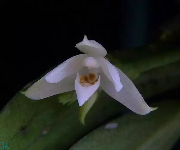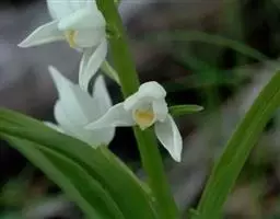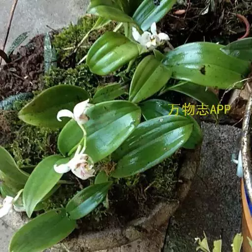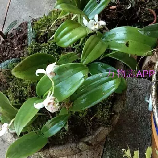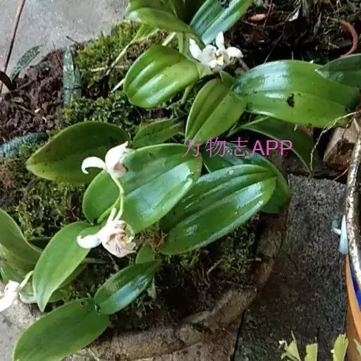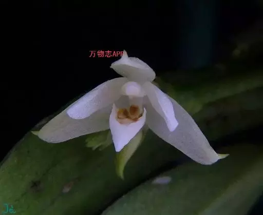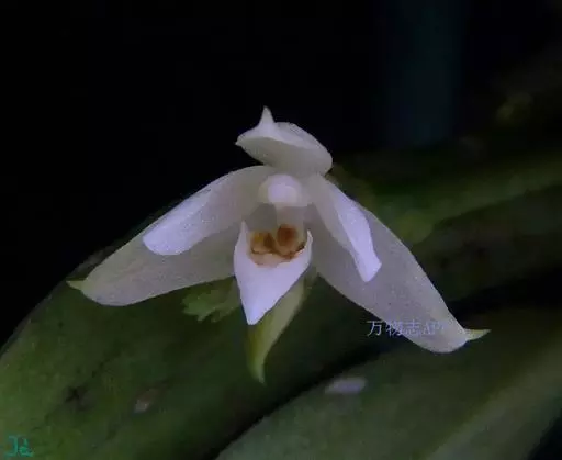 花序1个,自两叶片之间发出,长10-30厘米,具2-6朵花,上部常弯曲,基部具1枚鞘状物;花苞片通常披针形或线形,长5毫米,宽近1毫米,极少卵状披针形,长达8毫米,宽3毫米;花梗和子房长约1.5厘米;花白色,唇瓣上有紫色斑纹;中萼片椭圆状披针形,长约17毫米,宽约5毫米,先端钝;侧萼片镰状披针形,长约15毫米,宽近5毫米,先端钝,基部与蕊柱足合生成明显的萼囊。