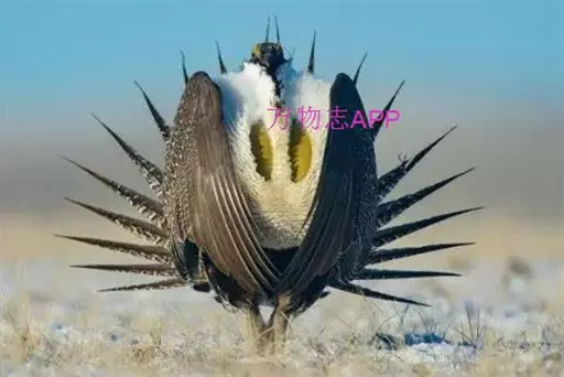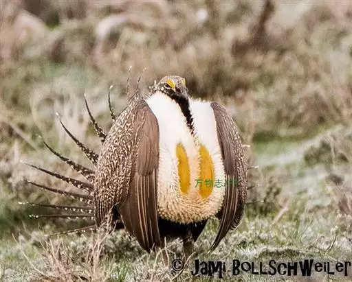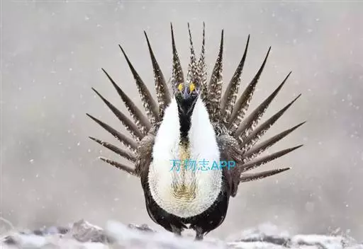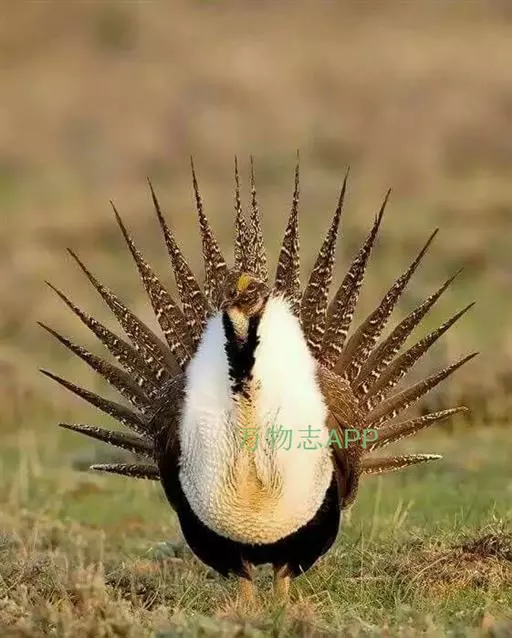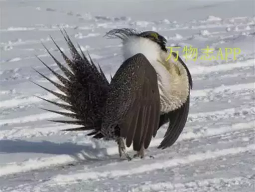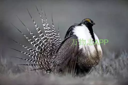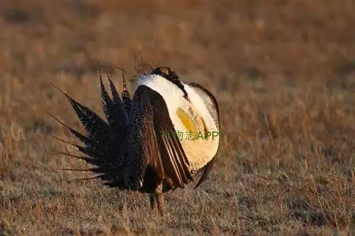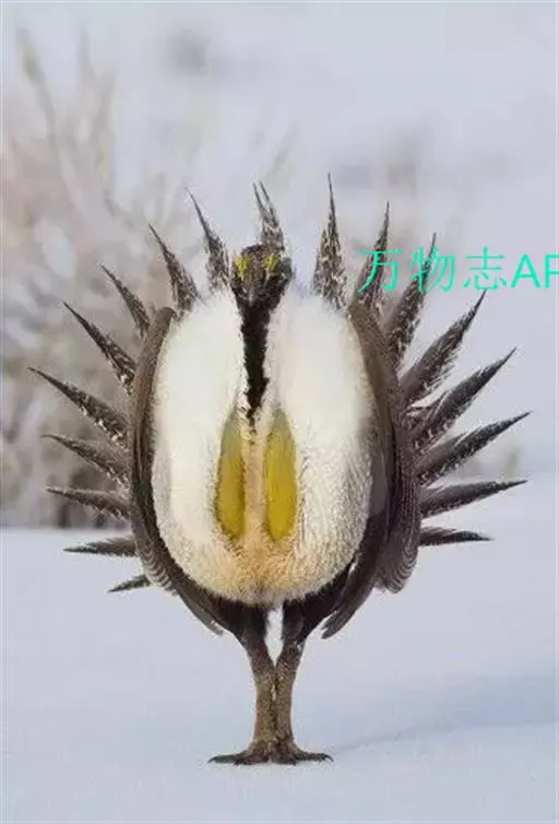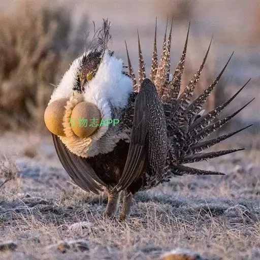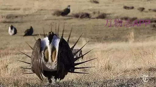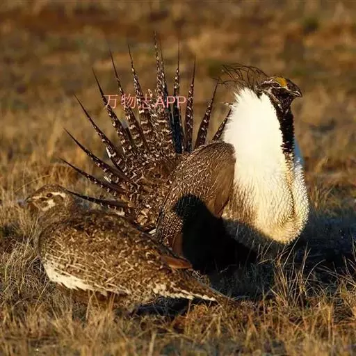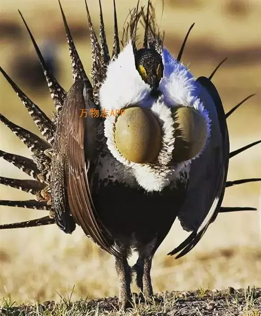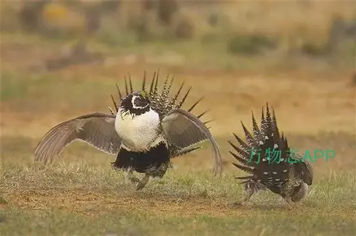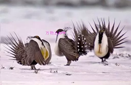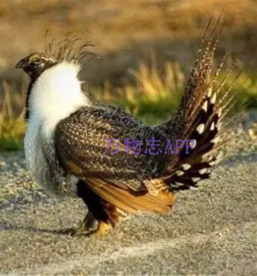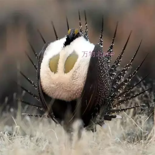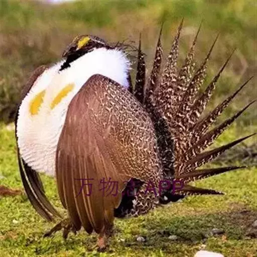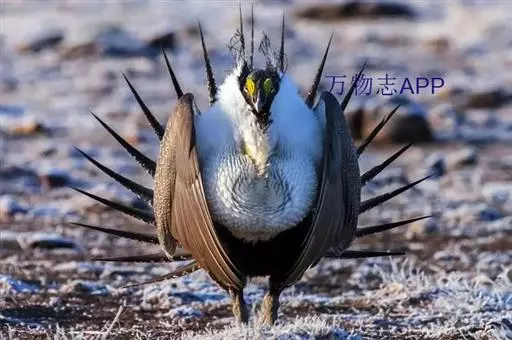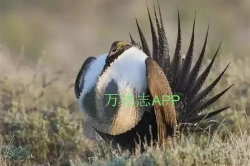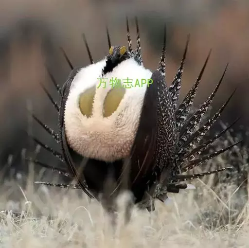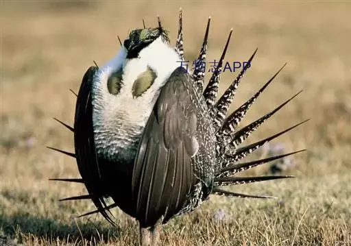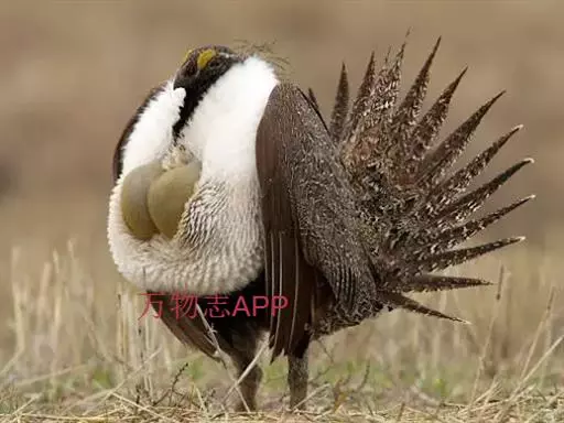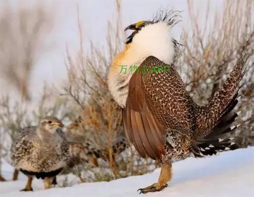艾草松鸡(学名:Centrocercus urophasianus):是北美洲最大的松鸡。身高48-76厘米,体重2300-3200克。雄性大于雌性,更重。雄性长着两个大胸,雌性却没有胸。 颈上有两个黄色的囊,可以在求偶时充气以吸引异性。走禽,体结实,喙短,呈圆锥形,适于啄食植物种子;翼短圆,不善飞;脚强健,具锐爪,善于行走和掘地寻食。雄鸟具大的肉冠和美丽鲜艳的羽毛,早成鸟,鼻孔和脚均有被羽,以适应严寒。