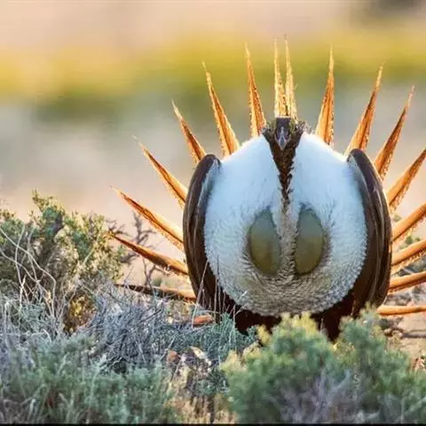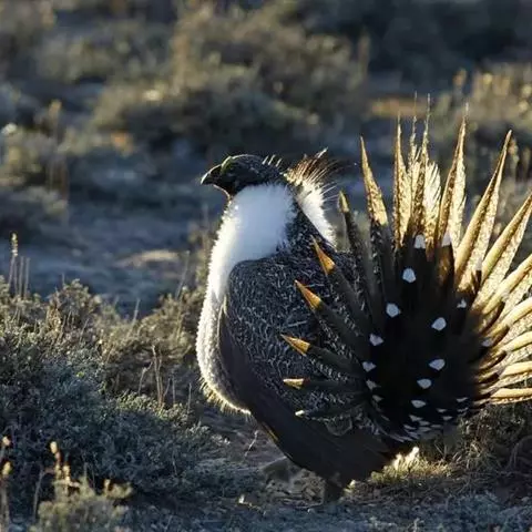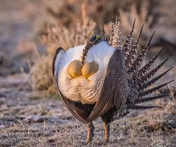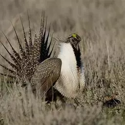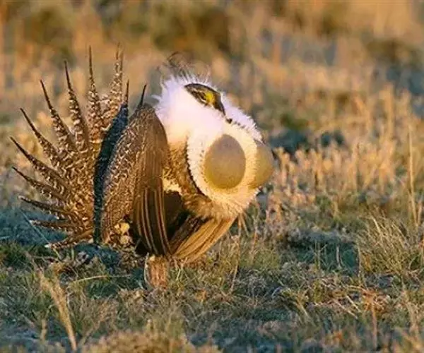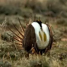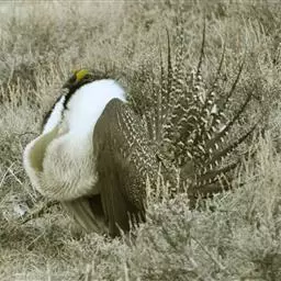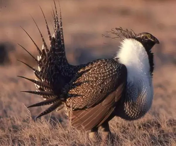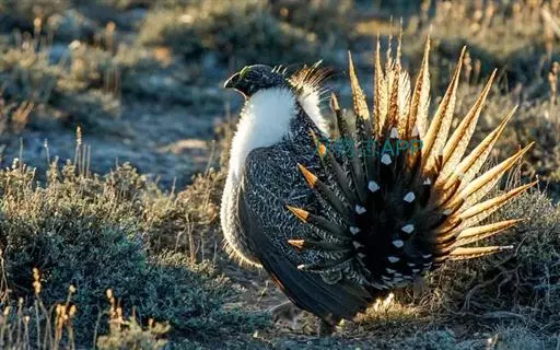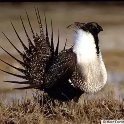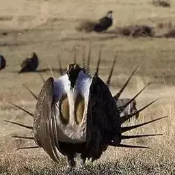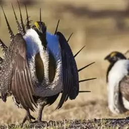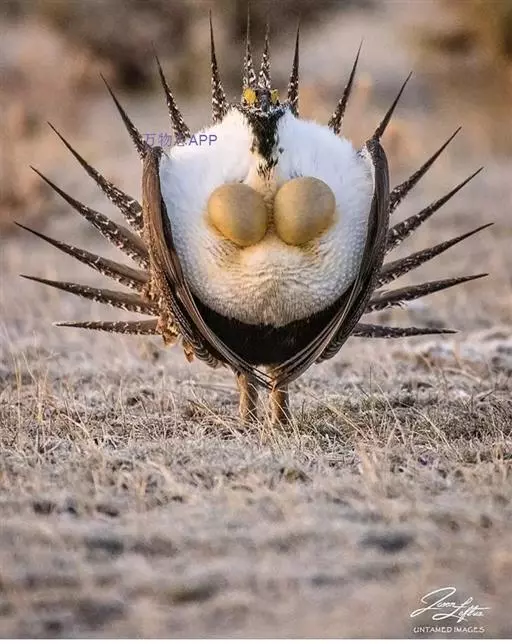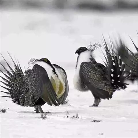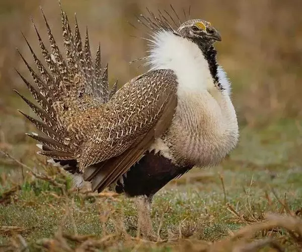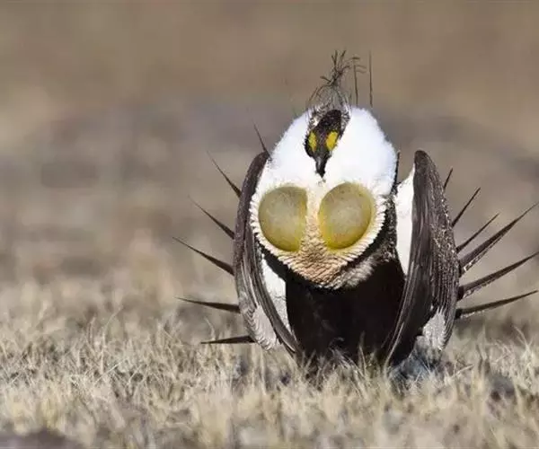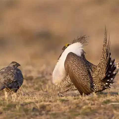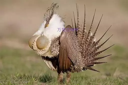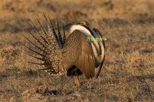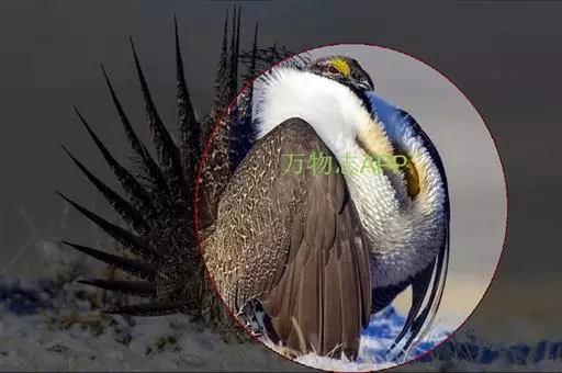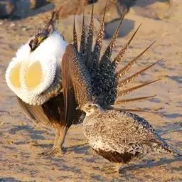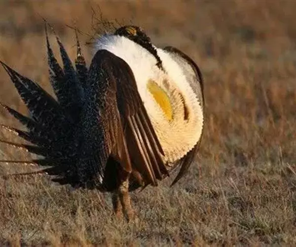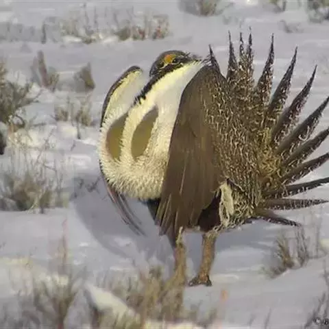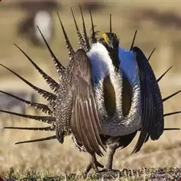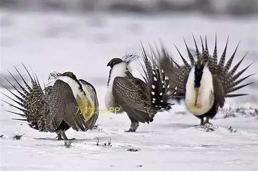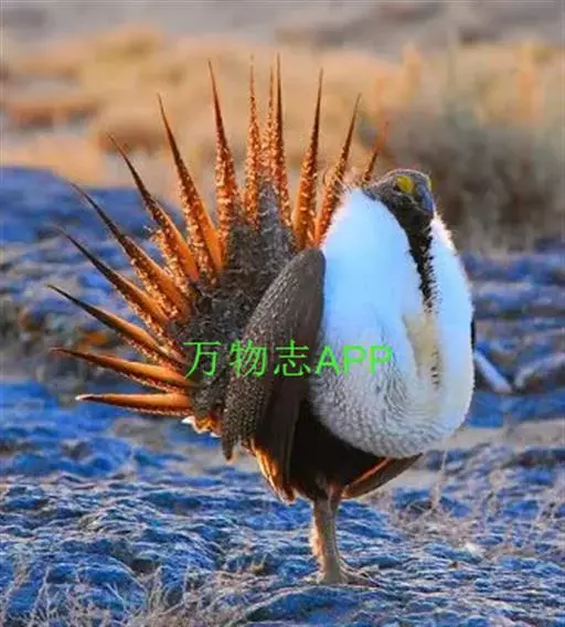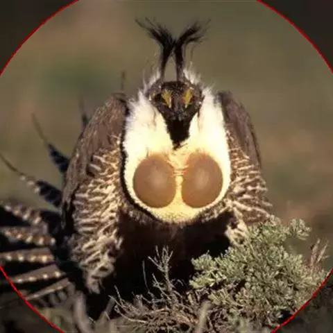 艾草松鸡(学名:Centrocercus urophasianus):是北美洲最大的松鸡。身高48-76厘米,体重2300-3200克。雄性大于雌性,更重。雄性长着两个大胸,雌性却没有胸。 颈上有两个黄色的囊,可以在求偶时充气以吸引异性。走禽,体结实,喙短,呈圆锥形,适于啄食植物种子;翼短圆,不善飞;脚强健,具锐爪,善于行走和掘地寻食。雄鸟具大的肉冠和美丽鲜艳的羽毛,早成鸟,鼻孔和脚均有被羽,以适应严寒。