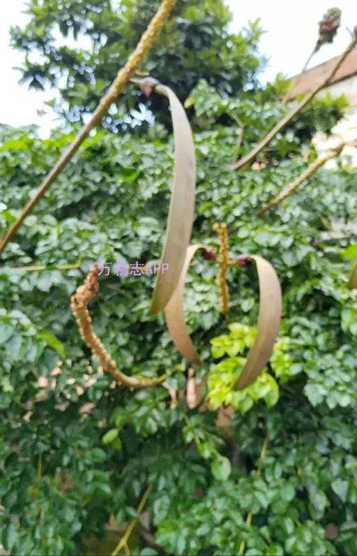 荚果狭而薄,倒披针状长圆形,长6-10厘米,宽1.5-2厘米,无翅,先端有长喙,无毛,不开裂,成熟时黑褐色;种子6-9颗。花果期几乎全年。
