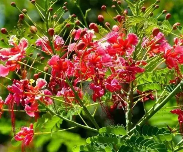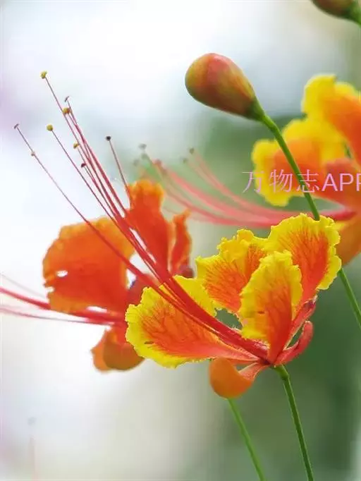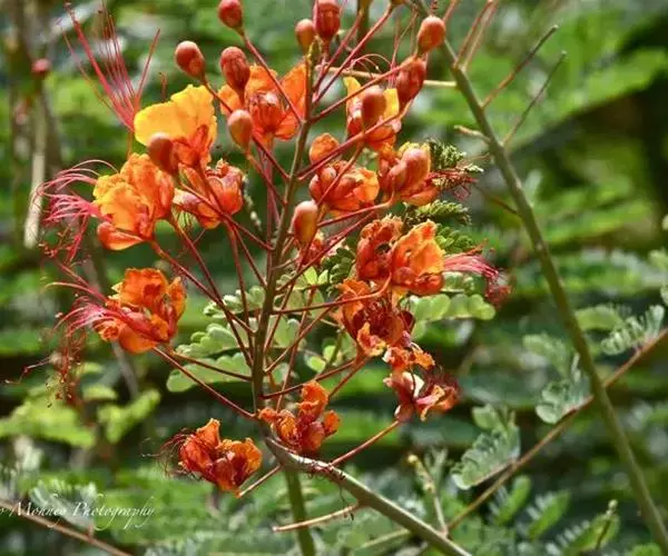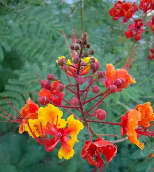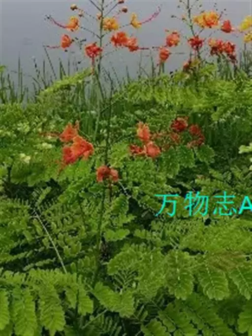金凤花,豆科云实属直立常绿灌木。高达3米,花冠橙红色,边缘金黄色,如火焰蝴蝶般常年于枝头盛开,为热带地区有价值的观赏树木之一。