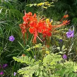 金凤花(学名:Caesalpinia pulcherrima (L.) Sw.):大灌木或小乔木;高达3米,枝绿或粉绿色,有疏刺。二回羽状复叶4对至8对,对生,小叶7对至11对,长椭圆形或倒卵形,基部歪斜,顶端凹缺,小叶柄很短。总状花序顶生或腋生,花瓣圆形具柄, 橙或黄色,花梗长达7厘米。荚果黑色。种子6颗至9颗。花果期几乎全年。