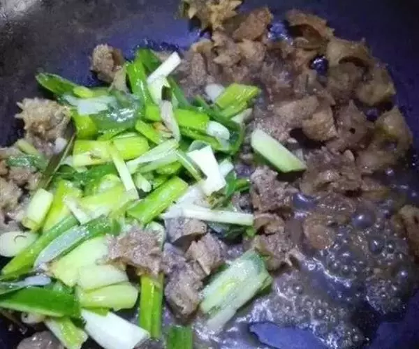 然后倒入韭菜,快速翻炒,放一些盐,很短时间后关火都可以,锅的余热还会起作用