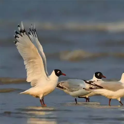 黑嘴鸥 中型水鸟,体长31~39厘米。嘴黑色,脚红色。夏羽头黑色,眼上和眼 下具白色星月形斑,在黑…