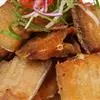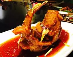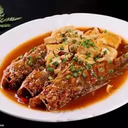 鱼制熟的手法不同寻常,辣酱风味特别,成菜风格独特。做这道菜时考虑到了一个细节:鱼需要离火浸炸,这样需要占用一个油锅,再炒菜时需要重新上火加热也多用了煤气,为了方便且节省点滴成本,我想出了这个办法:油烧热后浇到放有鱼的盆子中,用油把鱼浸熟,这样可把锅空出来炒其他菜。在酱料的制作上也颇费心思: 再加上咸鱼粒、腊八豆等,吃起来感觉味道很鲜且有点像肉躁子的做法,感觉更柔和一些。