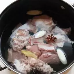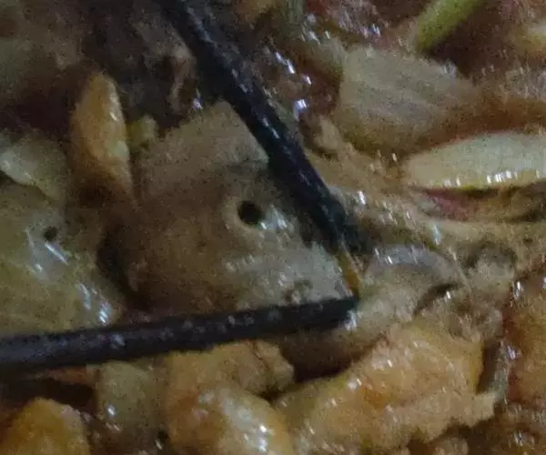 调料:秘制辣酱200克、洋葱丝50克、肉末25克、葱花成克、熟芝麻3克、盐3克、料酒10克、姜片5克、葱段10克、老油25克、色拉油4000克(实耗50克)、小米辣50克、姜、蒜米各25克。