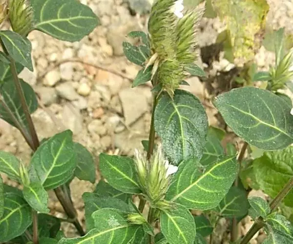 鳞花草 直立、多分枝草本,高可达1米;小枝4棱,除花序外几全体无毛。叶纸质,长圆形至披针形,有时近卵形,长4-10厘米,宽1-3.5厘米,顶端渐尖或短渐尖,钝头,基部多少下延,通常浅波状或有疏齿,上面光亮,两面均有稍粗的针状钟乳体;侧脉每边7-9条;叶柄长5-10毫米。穗状花序顶生和近枝顶侧生,卵形,长1-3厘米;苞片长圆状卵形,长约7毫米,顶端具刺状小凸起;小苞片稍狭,和苞片及萼裂片均在背面和边缘被长柔毛;花萼后裂片较大,披针状卵形,长约7毫米,前裂片中部以下合生;花冠白色,长约7毫米,喉部内面密被倒生、白色长柔毛,上唇直立,阔卵形,不明显2裂,下唇裂片近圆形;花药2室,药室邻接,斜叠生,花粉粒长球形,42(40-45)微米×28 (26-29)微米,具3孔沟,沟长,两端尖,表面具网状雕纹;花柱无毛。蒴果长圆形,长约6毫米,无毛;种子每室2粒。花期早春。