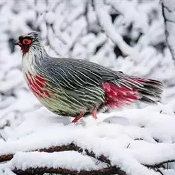 体大的灰褐色鹑类。胸灰色具黑色细纹。与相似种类四川雉鹑不同处在于栗色喉块外缘近白。有猩红色眼周裸皮。…
