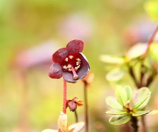 花序顶生,伞形,具1-4(5)花;花梗长达5厘米,直立,带红色,被疏鳞片;花萼大,5裂至基部,长1-6毫米,粉红色至深紫色或黄绿色,有时带白霜,裂片圆形或至卵状长圆形,外面常无鳞片;花冠宽钟状,下垂,长1-2(-2.3)厘米,肉质,紫红色至暗紫色,外面带白霜,无鳞片,5裂片短于花管;雄蕊(8-)10,不等长,短于花冠,花丝下半部被柔毛;子房5室,疏被鳞片,花柱粗壮,稍弯或下倾,无毛。