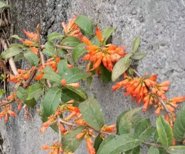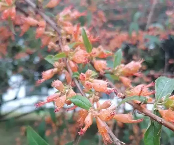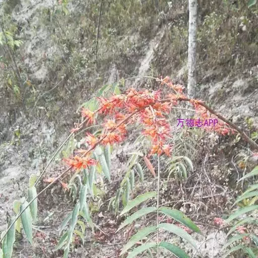 1-15花组成短聚伞状圆锥花序,长约3cm,被短柔毛;花梗长3-5mm;萼筒花瓶状,鲜红色,长9-15mm,裂片矩圆状卵形,长约2mm;花瓣小而薄,淡黄色,线状披针形,与花萼裂片等长,稀过;雄蕊12,突出萼外;子房矩圆形,2室,花柱细长,超过雄蕊。