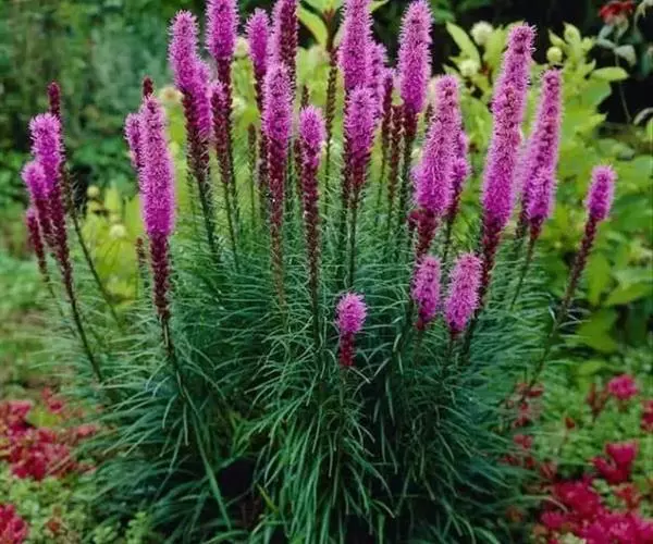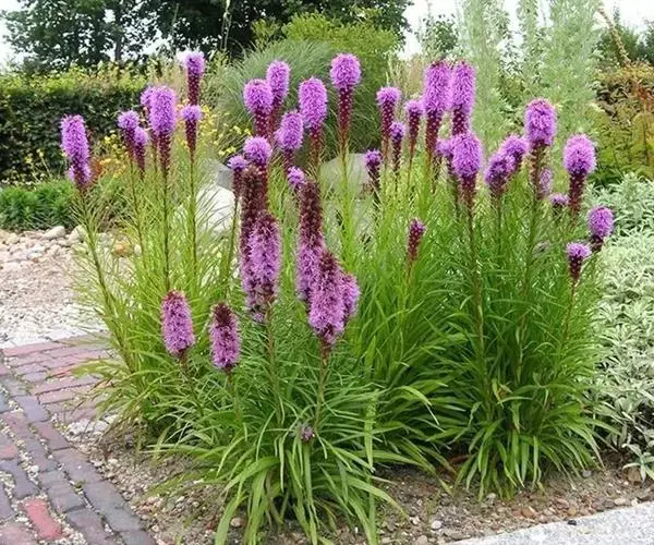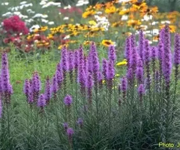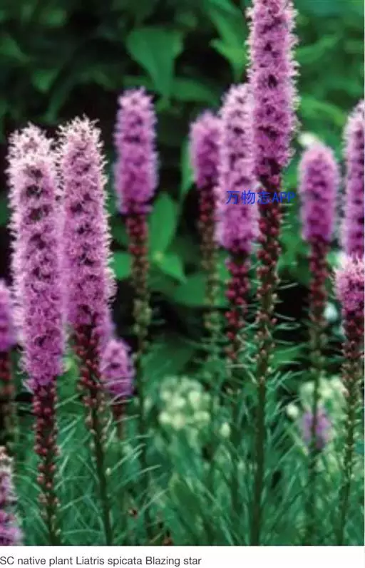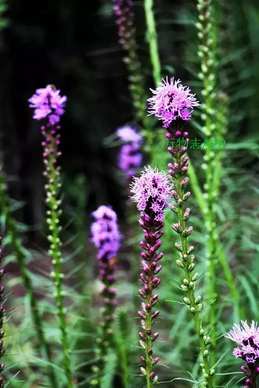 蛇鞭菊花葶直立且多叶。叶线形、基生,叶色浓绿。头状花序排列成密穗状,每个花序由300朵左右管状花组成,花紫色,有限花序,花期在夏末秋初的少花季节,约40天。蛇鞭菊姿态优美,马尾式的穗状有限花序直立向上,颇具特色,适宜布置花境或路旁带状栽植,庭院自然式丛植。由于花期长观赏价值极高,不仅是园林绿化树种珍品,也是重要的插花材料。应用于庭院、别墅的花境,挺拔秀丽,野趣十足。作为背景材料或丛植点缀于山石、林缘。也可作切花观赏,是一种有实力的配角。