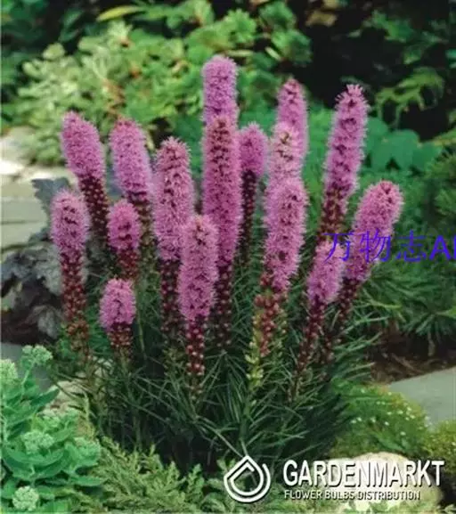 蛇鞭菊(学名:Liatris spicata (L.) Willd.):多年生草本植物。茎基部膨大呈扁球形。花红紫色。花期夏、秋季。因多数小头状花序聚集成密长穗状花序,小花由上而下次第开放,好似响尾蛇那沙沙作响的尾巴,呈鞭形而得名。是一种宿根植物,蛇鞭菊花期长,自然花期盛夏。花茎挺立,花色清丽,不仅有自然花材之美,而且具美好的花寓意。