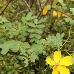 茎纤细,长1-3米,幼时微被淡黄色短柔毛。叶具羽状3小叶;托叶小,披针形,长1-2毫米;生于茎上部的叶具短柄或近无柄,生于下部的通常略长,有时长可达5.5厘米,极纤细,无毛或被短柔毛;小叶膜质,近心形或肾形,长1-3厘米,宽1.2-2.8厘米,先端近圆形而微凹,常有细凸尖,基部截形或微心形,两面无毛或下面主脉微被短柔毛,小脉纤细,网状,略可见;小托叶小,刚毛状;小叶柄极短,微被毛。总状花序腋生, 纤细,长约2-7厘米,微被毛或无毛,有花2至数朵;花梗纤细;花萼膜质,先端斜截形,无毛,长约5毫米;花冠淡黄色,长约1.2-1.5厘米,各瓣均具瓣柄,旗瓣倒卵形,基部具2钝耳,内面基部具2胼胝体,翼瓣与龙骨瓣等长;雄蕊二体;子房无毛,具子房柄,花柱上部增大,扁平。柱头头状。荚果倒披针形至长椭圆形,略弯,长约3厘米,宽4-6毫米,具短果颈,裂片卷曲或平展;种子3-5颗,肾形,棕黑色,长约3毫米。花期8-9月,果期10-12月。