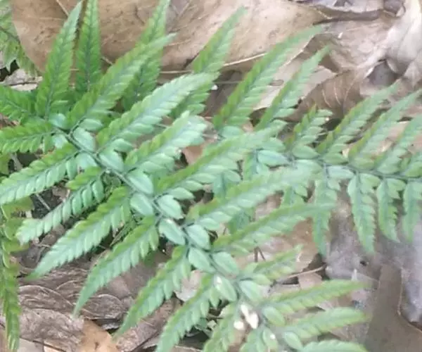 植株高30-60厘米。根茎直立,密被狭卵形深棕色鳞片。叶簇生,叶柄长16-30厘米,基部直径2-4毫米,禾秆色,腹面有纵沟,下部密生披针形及线形黑棕色鳞片,向上部渐成为线形鳞片,鳞片边缘睫毛状;叶片宽披针形或狭卵形,长20-42厘米,宽6-14厘米,先端长渐尖或成尾状,基部圆楔形或截形,二回羽状;羽片20-26对,互生,平展或略斜向上,柄极短,线状披针形,中部的长4-9厘米,宽1-1.5厘米,先端渐尖至尾状,基部偏斜,上侧截形,下侧宽楔形,羽状;小羽片7-13对,互生,略斜向上,密接,柄极短,斜矩圆形,斜的卵形或三角卵形,下部的长5-10毫米,宽4-6毫米,先端急尖或钝,有小刺头,基部斜的宽楔形,上侧有三角形耳状凸,边缘有或长或短的小尖齿;基部上侧第1片增大,卵形或三角卵形,长7-15毫米,宽4-6毫米,有时羽状分裂;小羽片具羽状脉,侧脉常为二叉状,腹面隐没,背面微凹下或微凸起。叶为薄革质,背面疏生纤毛状基部扩大的黄棕色鳞片;叶轴腹面有纵沟,背面密生鳞片,鳞片线形,基部扩大边缘睫毛状,黑棕色间或为棕色。孢子囊群位于小羽片主脉两侧,每个小羽片3-9个;囊群盖圆形,盾状,全缘。