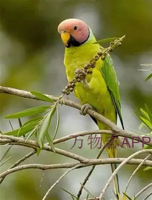 花头鹦鹉(学名:Psittacula roseata)是中型鸟类,仅有2个亚种。体长26-36厘米,体重85-90克。是典型的攀禽,鸟喙强劲有力,喙钩曲,上颌具有可活动关节,喙基部具有腊膜。肌肉质舌厚。脚短,强大,对趾型,两趾向前两趾向后,适合抓握和攀援生活。头部粉红色,到了头部后方、颈部均变为蓝紫色。体羽主要为黄绿色,上体颜色较深,翅绿色。雌雄鸟头部颜色有别:雄鸟为玫瑰红,雌鸟呈灰蓝色。晚成雏。主要栖息于约1500米的森林地带、次要林区和部份被开垦过的地区、干燥以及潮湿的热带草原等地。以坚果、浆果、嫩枝芽、谷物、种子等为食。分布于孟加拉国、柬埔寨、中国,印度、缅甸、泰国和越南等国。