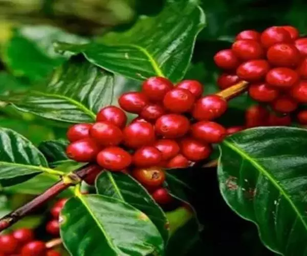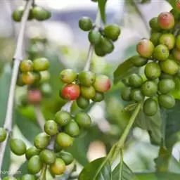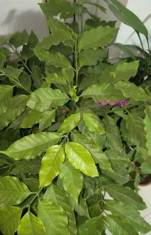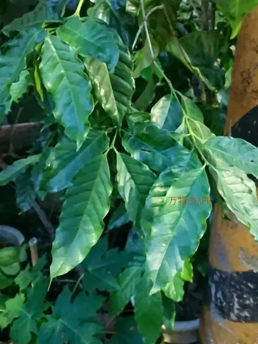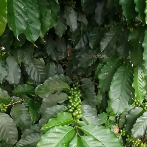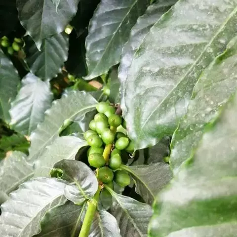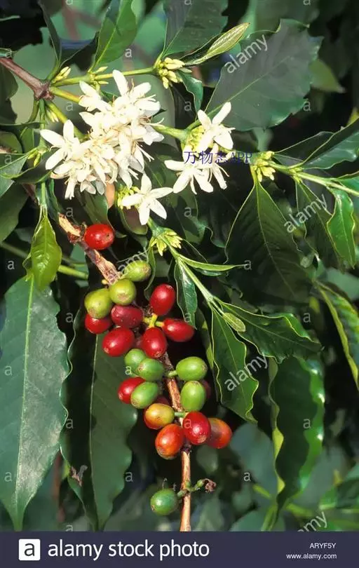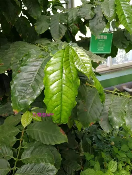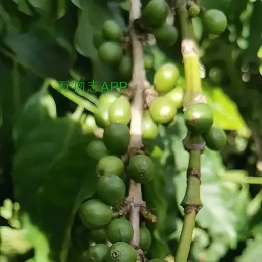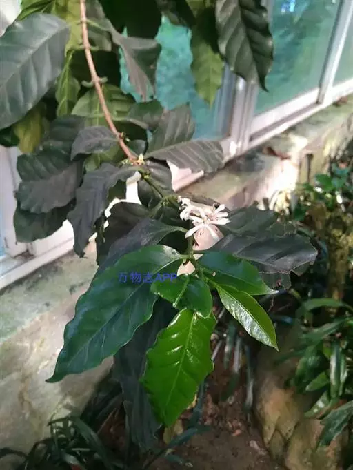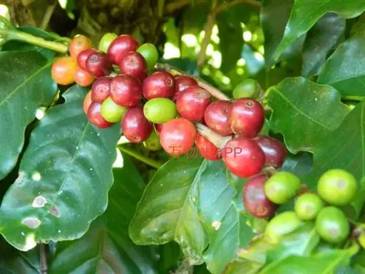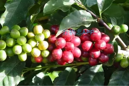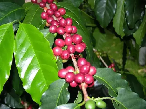 小粒咖啡(Coffea arabica L.)小乔木或大灌木,高5-8米;老枝灰白色,幼枝无毛。叶薄革质,卵状披针形或披针形,两面无毛;叶柄长8-15毫米;托叶阔三角形。聚伞花序数个簇生于叶腋内,每个花序有花2-5朵,无总花梗或具极短总花梗;花芳;萼管管形;花冠白色,裂片常长于花冠管;花药伸出冠管外;花柱长12-14毫米,柱头长3-4毫米。浆果成熟时红色,外果皮硬膜质,中果皮肉质,有甜味;种子背面凸起,腹面平坦,有纵槽。花期3-4月。