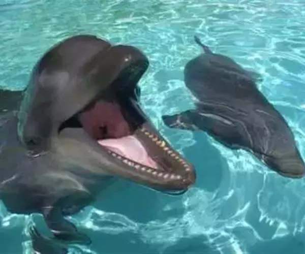 宽吻海豚没有声带,通过身体的运动和喷气孔下方的六个气囊发出的声音来交流。每只宽吻海豚都有独特的声音特征。