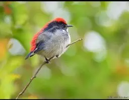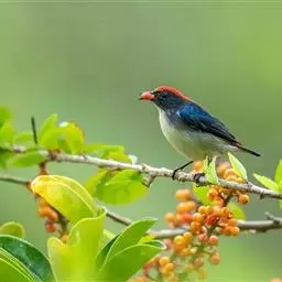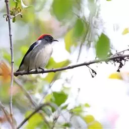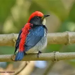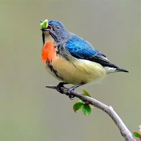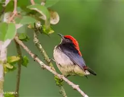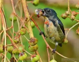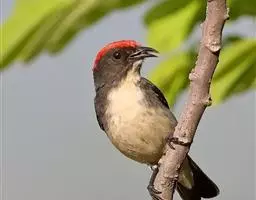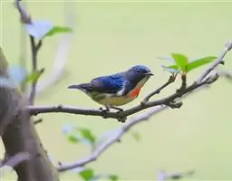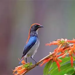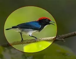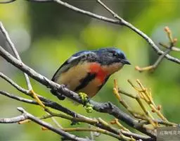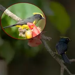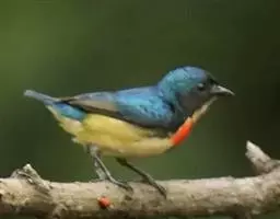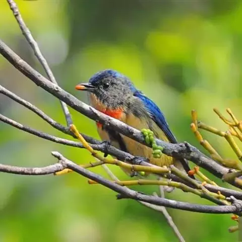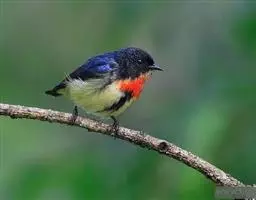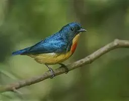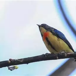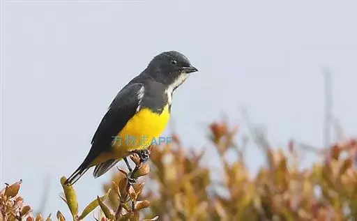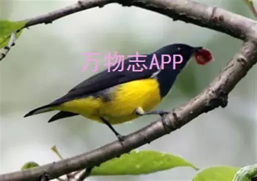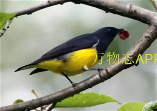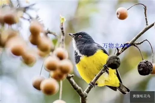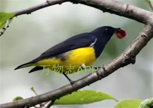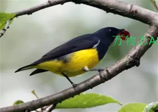 黄腹啄花鸟(学名:Dicaeum melanoxanthum):体重11-16克,体长104-117毫米。是一种体型大,下腹部为艳黄色的啄花鸟,雄鸟特征为头黑色,喉部有白色纵斑、喉侧及上体成对比,两翅和尾黑色,外侧尾羽内翈具白色斑块。其余下体淡黄色。雌鸟似雄鸟但色暗。虹膜褐色,嘴黑色,脚黑色。