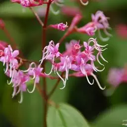 伞状聚伞花序,腋生,总梗长约2毫米至几无,密被小腺点;花梗长约3毫米,密被小腺点;花萼钟状漏斗形,长约4毫米,密被小腺点,钝四棱形,裂片4(-5),广卵形,长约1毫米,具小尖头;花瓣4(-5),白色至粉红色,卵形,顶端渐尖或近急尖,长约4毫米,于右上角突出一小片;雄蕊4(-5),等长,花丝长约4毫米,花药长约4毫米,粉红色,呈曲膝状,药隔微膨大,下延直达花药基部,有时几呈小瘤状;子房坛形,下位,4室,顶端具4个小突起,被疏小腺点。蒴果椭圆形,4裂,为宿存萼所包;宿存萼与果等长,檐部平截,被示腺点。花期6-8月,果期10-12月,有时茎上部开花,下部果熟。
