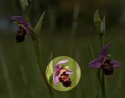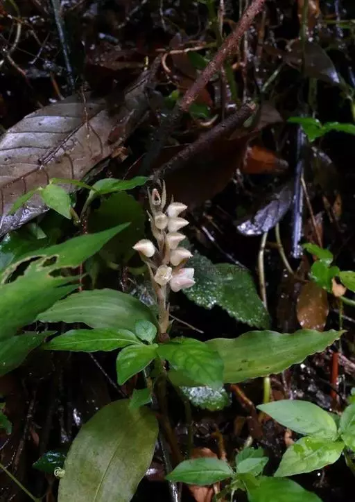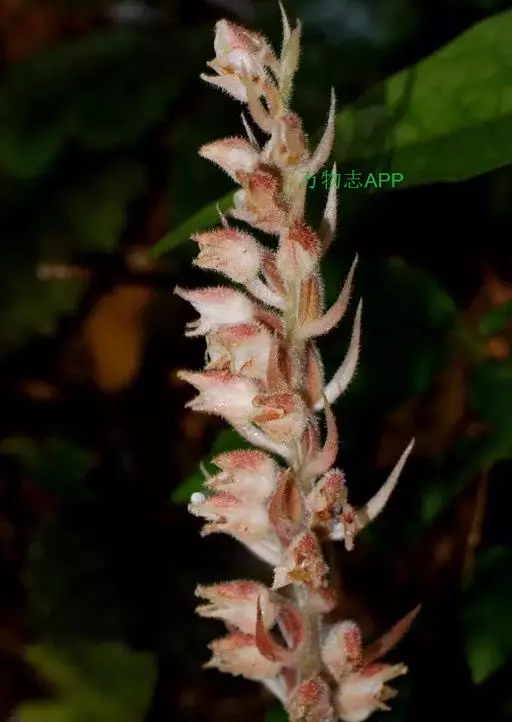 花茎直立,长6-8厘米,被毛;总状花序具几朵至多朵密生而常偏向一侧的花,花序梗极短或长,无或具几枚鞘状苞片;花苞片披针形,长1-1.5厘米,宽2-2.5毫米,背面被毛;子房圆柱形,被毛,连花梗长8-10毫米;花中等大,半张开,白带粉红色、白带淡绿色或近白色;萼片狭卵形,凹陷,长5-8毫米,宽3.5-4毫米,先端钝,具1脉,背面被毛。