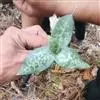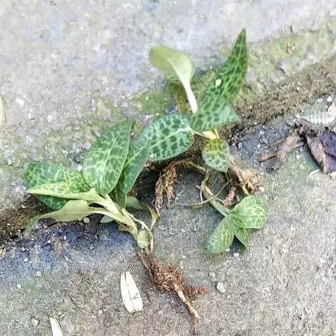 多叶斑叶兰植株高15-25厘米。根状茎伸长,茎状,匍匐,具节。茎直立,长9-17厘米,绿色,具4-6枚叶。叶疏生于茎上或集生于茎的上半部,叶片卵形至长圆形,偏斜,长2.5-7厘米,宽1.6-2.5厘米,绿色,先端急尖,基部楔形或圆形,具柄;叶柄长1-2厘米,基部扩大成抱茎的鞘。