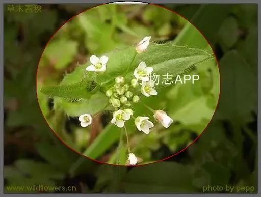 总状花序顶生及腋生,果期延长达20厘米;花梗长3~8毫米;萼片长圆形,长1.5~2毫米;花瓣白色,卵形,长2~3毫米,有短爪。短角果倒三角形或倒心状三角形,长5~8毫米,宽4~7毫米,扁平,无毛,顶端微凹,裂瓣具网脉;花柱长约0.5毫米;果梗长5~15毫米。