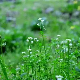 荠 ⑴浇水:荠菜种子细小,易受土壤水分影响。在出苗前,一定要注意浇水保湿,浇水时间以早晨露水未干时比较好,浇水要掌握“轻浇、勤浇”的原则,不能一次浇透,每隔1~2天浇一次。