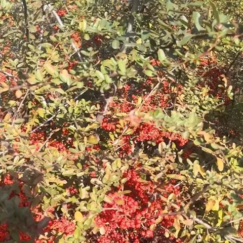 常绿灌木或小乔木,高达6米;通常有枝刺,稀无刺;嫩枝有黄褐色或灰色柔毛,老枝无毛。叶片椭圆形或长圆形,稀长圆倒卵形,长1.5-4厘米,宽1-1.6厘米,先端微尖或圆钝,有时具刺尖头,基部宽楔形或圆形,叶边通常全缘或有时具不显明的细锯齿,幼时有黄褐色柔毛,老时两面无毛,上面光亮,叶脉明显,下面微带白霜,中脉明显突起;叶柄长2-5毫米,通常无毛,有时具柔毛。花成复伞房花序,直径3-4厘米,花梗和花萼外被黄褐色柔毛;花梗长5-10毫米,花直径7-9毫米;萼筒钟状,外被柔毛;萼片浅裂,广卵形,先端钝,外被稀疏柔毛;花瓣白色,卵形,长4-5毫米,宽3-4毫米,先端微尖,基部具短爪;雄蕊20,花丝长约3毫米,花药黄色;花柱5,与雄蕊等长,子房上部密生白色绒毛。梨果扁球形,直径4-6毫米,亮红色。花期4-5月,果期9-11月。