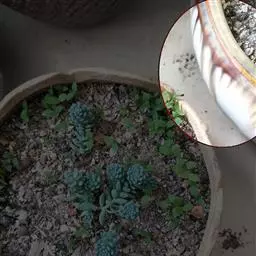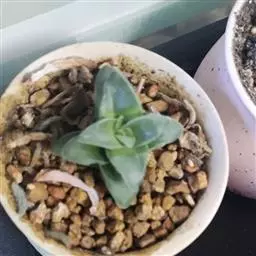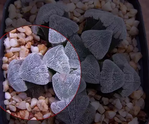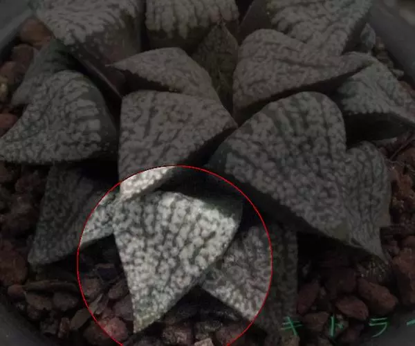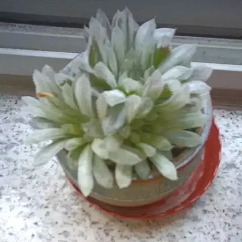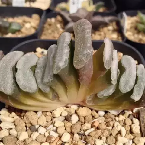 白银寿,植株低矮, 叶呈莲座状紧凑排 列, 叶顶端呈夹杂红色纹路的浓白色, 是此品种的 典型特征, 故名 “ 白银 ”。