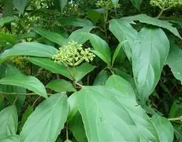 叶较狭,宽卵形或矩圆状卵形,有时椭圆状倒卵形,两端有时渐尖,下面常带绿白色,侧脉10-17对。花序直径4-10厘米,外围有4-6朵白色、木型的不孕花,具长花梗,花冠直径达4厘米,不整齐4-5裂;中央可孕花直径约3毫米,萼筒长约15毫米,花冠辐状,黄白色,裂片宽卵形,长约等于筒,雄蕊高出花冠,花药近圆形。果实先红色后变黑色,宽卵圆形或倒卵圆形,长5-6毫米,直径约4毫米;核扁,两端钝形,有1条上宽下窄的腹沟,背面中下部还有1条短的隆起之脊。花期4-5月,果熟期8-9月。