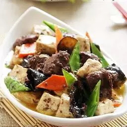 山珍豆腐是一道川菜,主料有豆腐,调料有大葱、姜、植物油、酱油、料酒。