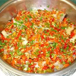 剁椒鱼头,以鱼头的“味鲜”和剁椒的“辣”为一体。火辣辣的红剁椒,覆盖着白嫩嫩的鱼头肉,冒着热腾腾清香四溢的香气。蒸制的方法,鱼头的鲜香被尽量保留在肉质之内,剁椒的味道又恰到好处地渗入到鱼肉当中,入口细嫩晶莹,带着一股温文尔雅的辣味。