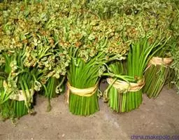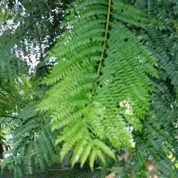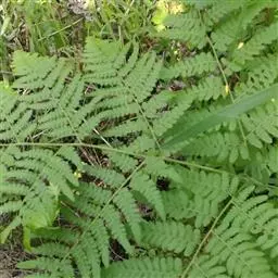 根状戏粗而短,斜升。叶簇生,直立,柄长30-50厘米,粗约3.5毫米,淡绿色或绿禾秆色,草质,密被锈色贴生的腺状毛,后渐变略光滑;叶片长30-40厘米,下部宽28-36厘米,三角状长圆形,基部最宽,渐尖头,四回羽状深裂;羽片约15对,互生,几开展,有柄,相距4-5厘米,彼此密接或向上部几呈复瓦状,基部一对最大,近对生,长15-18厘米,或更长,宽8厘米,几平展,长圆形,渐尖头,稍向上弯弓,基部近截形,对称,羽柄长约1.5厘米,三回羽状深裂;一回小羽片约15对,上先出,平展,密接,有短柄(长2毫米),长约4厘米,宽约1-1.2厘米,披针形,呈镰刀状,短渐尖,基部截形,对称,二回深羽裂;二回小羽片约10对,平展,接近,斜长圆形,长约6毫米,宽约4毫米,圆头,基部不等,下侧楔形,上侧截形,稍为耳形凸起,无柄,分离,向上的小羽片与有极狭翅的小羽轴合生,两侧圆浅裂达1/2,成为3-4对小裂片,全缘,微刺头,每片有小脉一条,不明显。叶为膜质,干后褐绿色或褐色。叶轴及羽轴有锈色腺毛密生。叶轴中部常有一枚珠芽生于腋间。孢子囊群而小,每小裂片一个,近顶生于小脉上,位于裂片的中央。