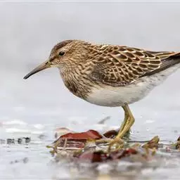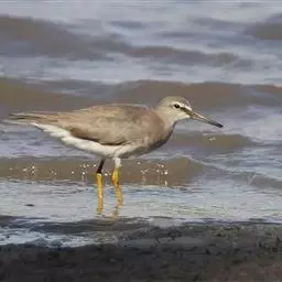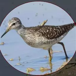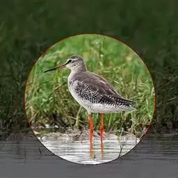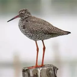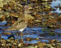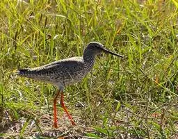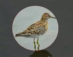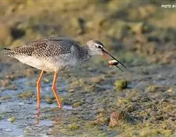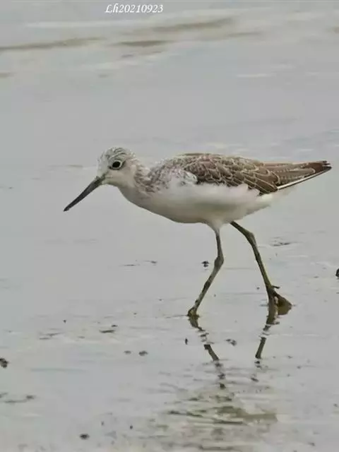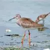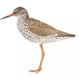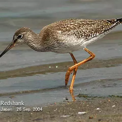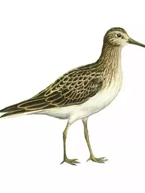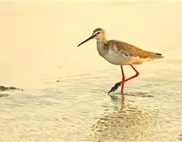 红脚鹬:体长28厘米,上体褐灰,下体白色,胸具褐色纵纹。飞行时腰部白色明显,次级飞羽具明显白色外缘。…
