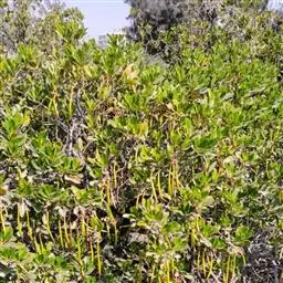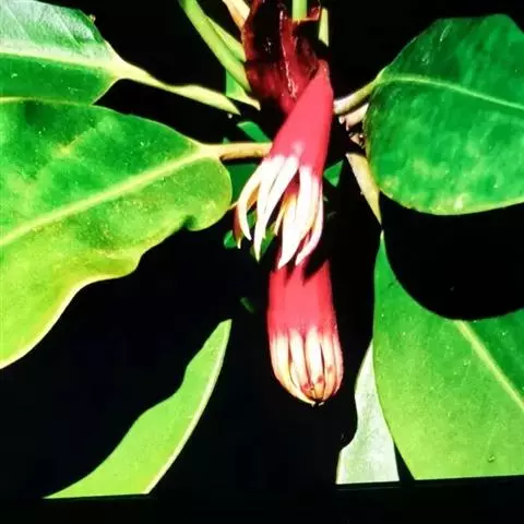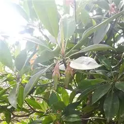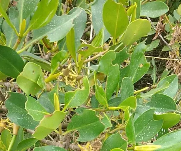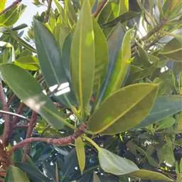 秋茄树(学名:Kandelia candel (L.) Druce)是红树科,秋茄树属灌木或小乔木,高可达3米;树皮红褐色;枝粗壮,有膨大的节。叶片椭圆形、矩圆状椭圆形或近倒卵形,叶脉不明显;托叶早落,有花,花具短梗,花萼裂片革质,花后外反;花瓣白色,膜质,雄蕊无定数,长短不一,花柱丝状,与雄蕊等长。果实圆锥形,胚轴细长,几乎全年开花结果。