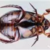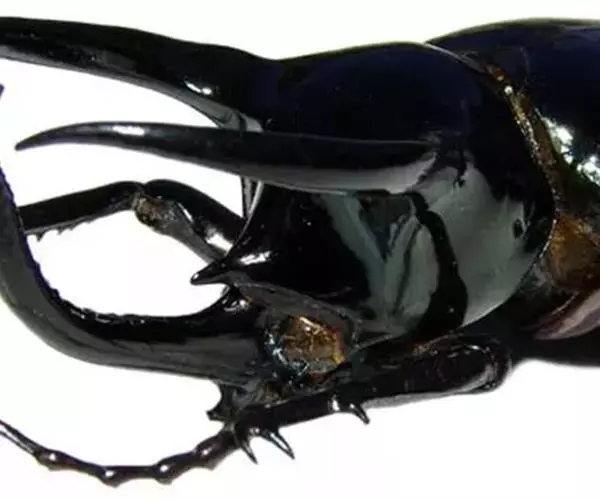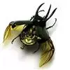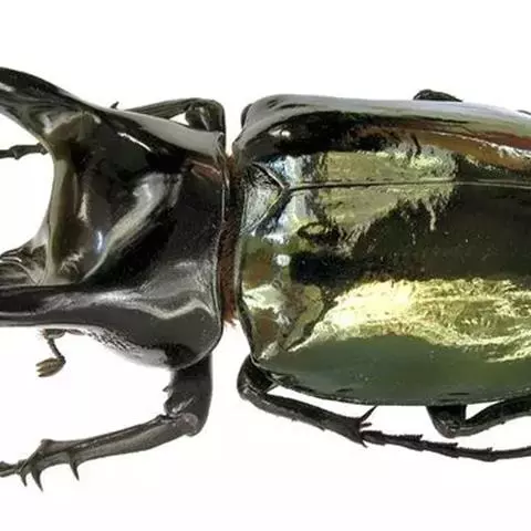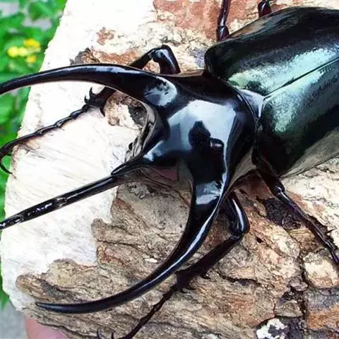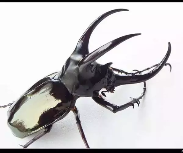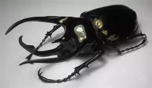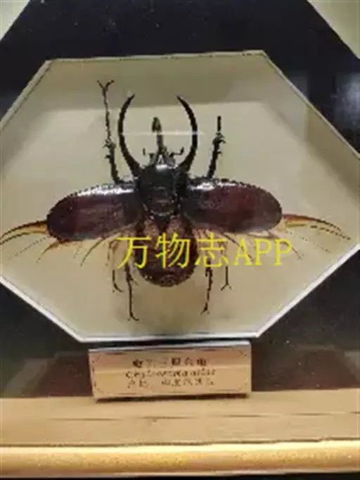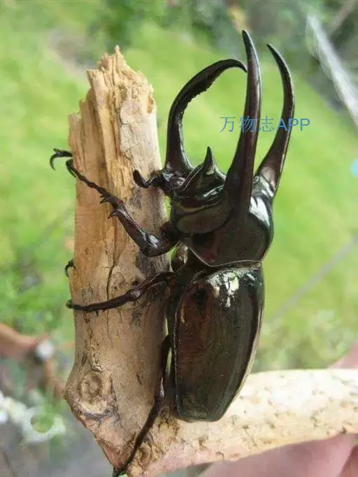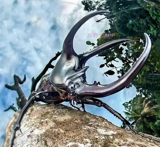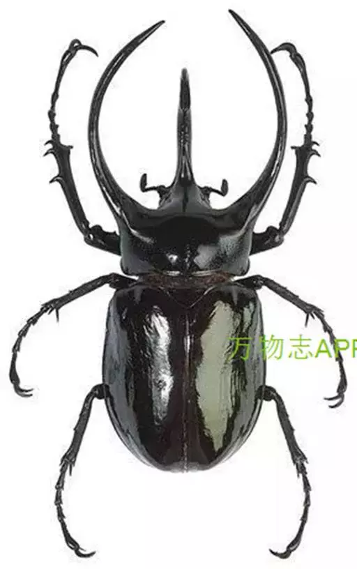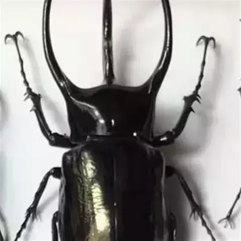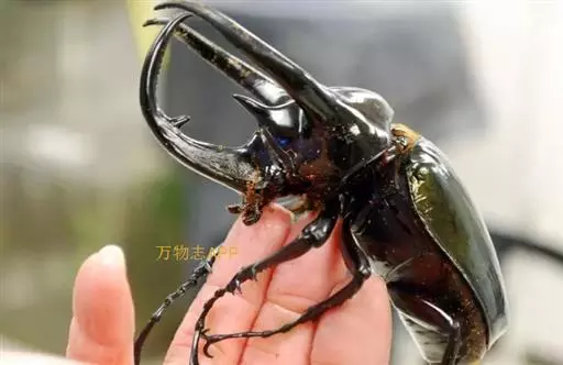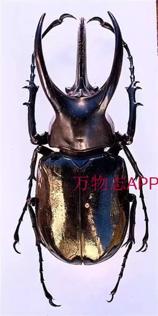南洋大兜虫,学名:Chalcosoma caucasus这是一只生在马来西重热带林中的器性洋大虫,它是体形最大的昆虫之一,可达惊人的12厘米,它长着三个长而锋利的触角一一其中两个长在躯干上,一个在头部,南洋大兜虫在与雄性对手争斗时使用这些触角,它们试图用触角抱紧对手的身体,然后用力将其抛开,胜利者将得与雌性个体文配的机会。雌性个体没有触角,且体形更小 。